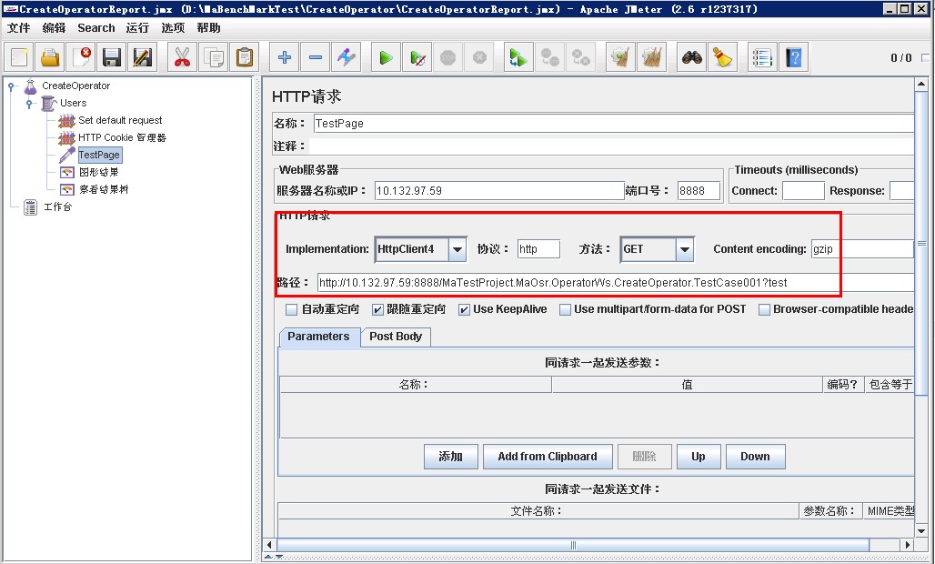 其中红色方框中的路径,便是Fitnesse上面case的路径,记得一点要加上?test,这样便告诉Jmeter这是一个执行Case的get 请求。