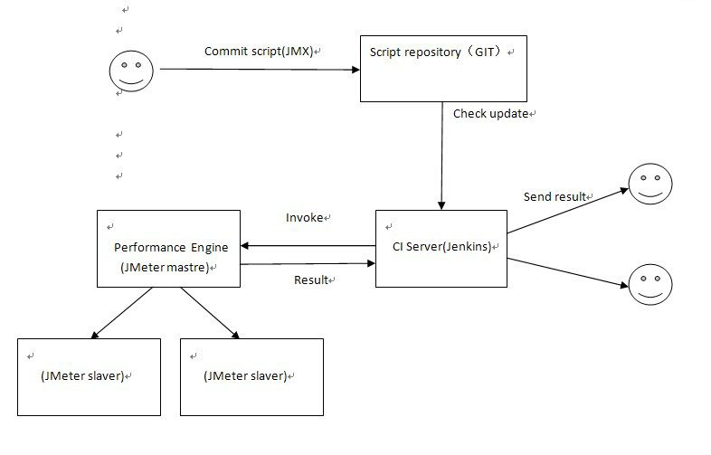 近在利用Jmeter来做一套自动化性能测试框架,做自动化性能测试框架的目的是希望能够针对系统做一个benchmark的性能测试,能够快速的在每个版本发布后,对该版本进行benchmark性能测试,以比较与上一个版本的性能是否发生变化,若发生变化便可以快速的通知开发人员以确定性能发生变化的模块或者代码。同时测试或者开发可以上传性能测试脚本到测试平台,测试平台接到测试脚本后可以进行性能测试并返回测试结果.基于这一点的考虑是,一般的测试工程师(特别想功能测试工程师)和开发工程师可能没有相关的性能测试环境供他们使用,因此建立这样的平台是希望能够让每个人都能快速的进行性能测试,而不需要关注性能测试环境(往往配置一个性能环境可能需要很长的时候).