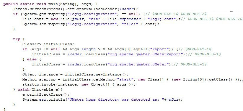 MAVEN是一个非常的项目管理工具,关于Maven和Ant的主要区别可以去网上查询,我们在这里主要介绍一下用MAVEN如何去运行JMeter, JMeter支持多种运行方式,有GUI方式和NONGUI方式,各有优势,我们在自动化性能测试平台的搭建中采用NonGUI方式来运行测试脚本,NonGuI方式其实也是通过Command命令来运行,那么如何通过Maven来调用呢,不用慌张,已经有Jmeter-maven-plugin这样一个Maven插件来运行Jmeter了,如果看过Jmeter源码的话,可以看到在Jmeter中有这样一个Class,叫做NewDriver.class,这个类是Jmeter的入口,我们可以看一下这个类的Main方法: