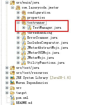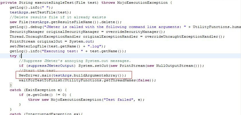 看到try模块中的后几行可以看到,通过Java反射机制,JMeter.start()方法被调用到,并且将相关的参数传递给该方法。因此我们可以想象到JMeter-maven插件中肯定也是通过调用这个方法来启动JMeter的,我们来看一下JMeter-maven-plugin这个插件(关于如何开发maven插件在这里不具体讲,可以参考网上资料)中的主要调用代码: