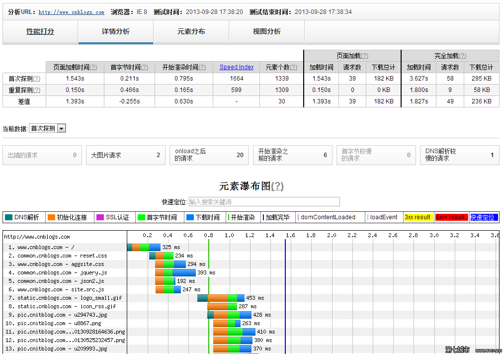 iv.统计出出错请求、大图片请求、onload之后的请求、开始渲染之前的请求、首字节较慢的请求及DNS解析较慢的请求个数。