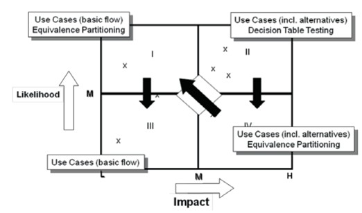 在基于风险的测试中,风险识别、风险分析、及风险缓解活动的制定奠定了定义测试方法的基础[ 4 ] 。每个风险项目相关的风险级别决定每个风险相关的测试工作(即减缓行动)所需要的精力。某些安全相关的标准规定了:要用的测试方法和要达到的基于风险度(见下文)的覆盖率。