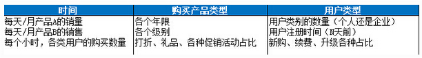 像破案一样,为了找出后的真相,需要先尽可能多地搜集线索。这些线索对应着现象,真相是原因。在搜集到线索后,需要进行初步的梳理,以备之后的深入分析。从原始需求可以看出,在这个负责人关注的这些数据中,首先重要的是关注销量,然后对销量进行更细纬度的查看。关注的数据可分类为以下3种类型:时间、购买产品类型、用户类型,具体数据分类如下表所示。
