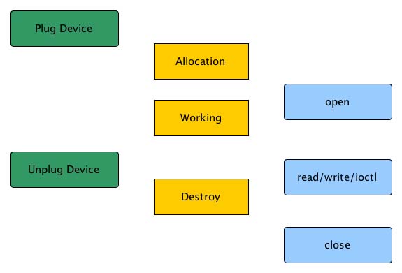 如上图所示,左边的绿色框图表示实际设备的插拔动作,中间黄色的框图表示内核中设备对象的生存周期,右边蓝色的框图表示用户程序系统调用的顺序。如果用户程序正在访问的时候设备突然被拔掉,驱动程序里的设备对象是否立刻释放呢?如果立刻释放,用户程序执行的系统调用一定会发生内存非法访问;如果要等到用户程序close之后再释放设备对象,我们应该怎么来实现?kref是为了解决类似的问题而生的。