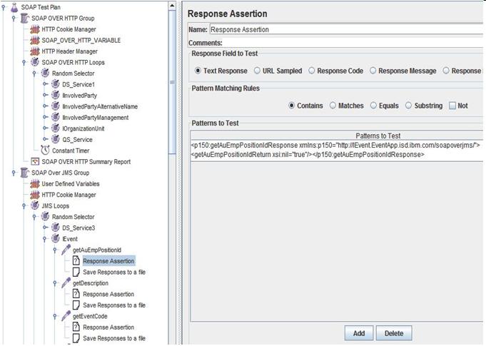 在测试计划中添加一个用户定义变量配置元素(User Defined Variables), 可以在里面定义服务器地址,日志路径,超时限制等变量,提供脚本重用。同时添加两个用户组,一个是 SOAP Over HTTP Group,一个是 SOAP Over JMS Group。在每个用户组下面分别添加一个总的循环控制器(Loop Controller),用以控制脚本循环次数。在总循环控制器下面添加随机选择器(Random Selector)用以随机选择运行测试脚本。下图是我们整个的 Test Plan。