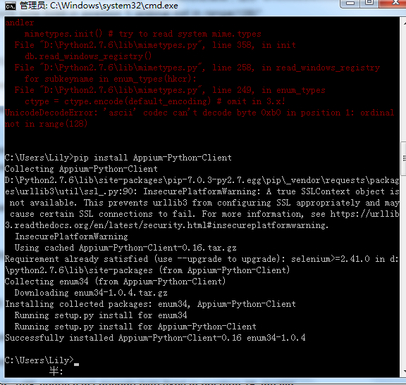 进入cmd,输入:pip install Appium-Python-Client ,执行后总是报错,提示“UnicodeDecodeError: 'ascii' codec can't decode byte 0xb0 in position 1: ordinal not in range(128)”