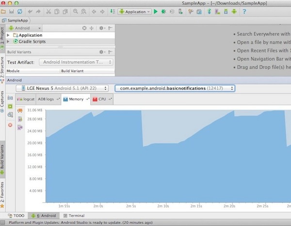 Memory Monitor已经内置在Android Studio中,因此你可以点击Android Studio的底部的”Memory”这个tab来切换到内存监视页面。当你切换到该页面的时候,Memory Monitor开始记录你的内存使用情况了。