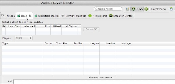 另一个能够帮助你收集更新关于内存泄漏信息和其他内存相关问题的工具是Android Device Monitor的DDMMS工具下的Heap。