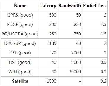 通过设置上面的参数,可以模拟出各种常用的网络环境,比如:2G,3G,4G,WiFi等等,同时也可以模拟一些异常情况,比如信号很差,延迟很大,丢包率高的情况。具体有哪些场景和参数设置,欢迎大家一起交流交流,下面是Comcast提供的一份参数配置(国外的网络和国内的很不一样吧,仅供参考,欢迎大家修正和补充)