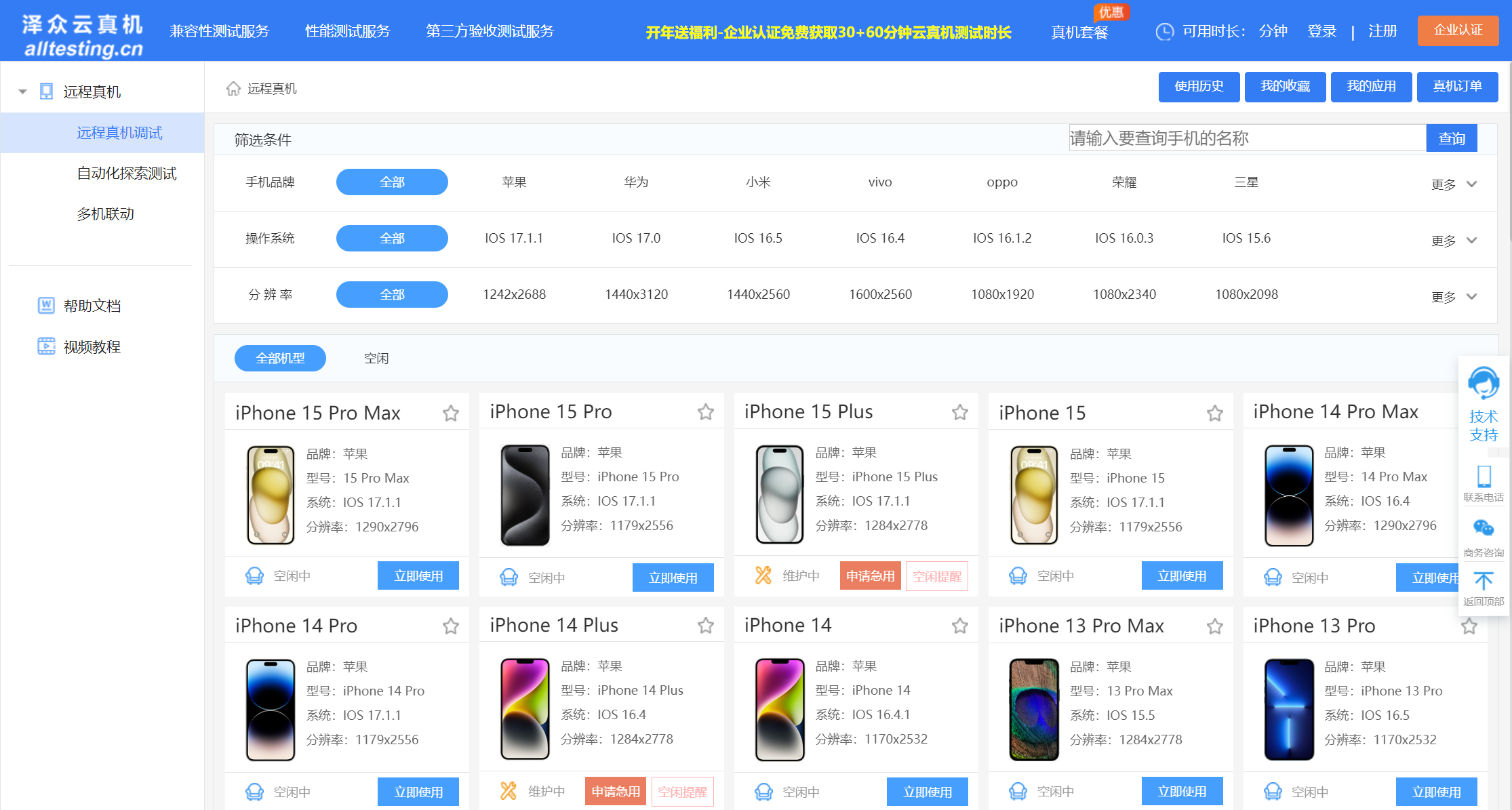 页面上方真机套餐中我们提供了多种套餐供您选择,您可以根据您的需求选择合适的套餐进行测试,如您有其他测试需求需要优惠活动可以咨询我们在线客服,为您进行后续服务。