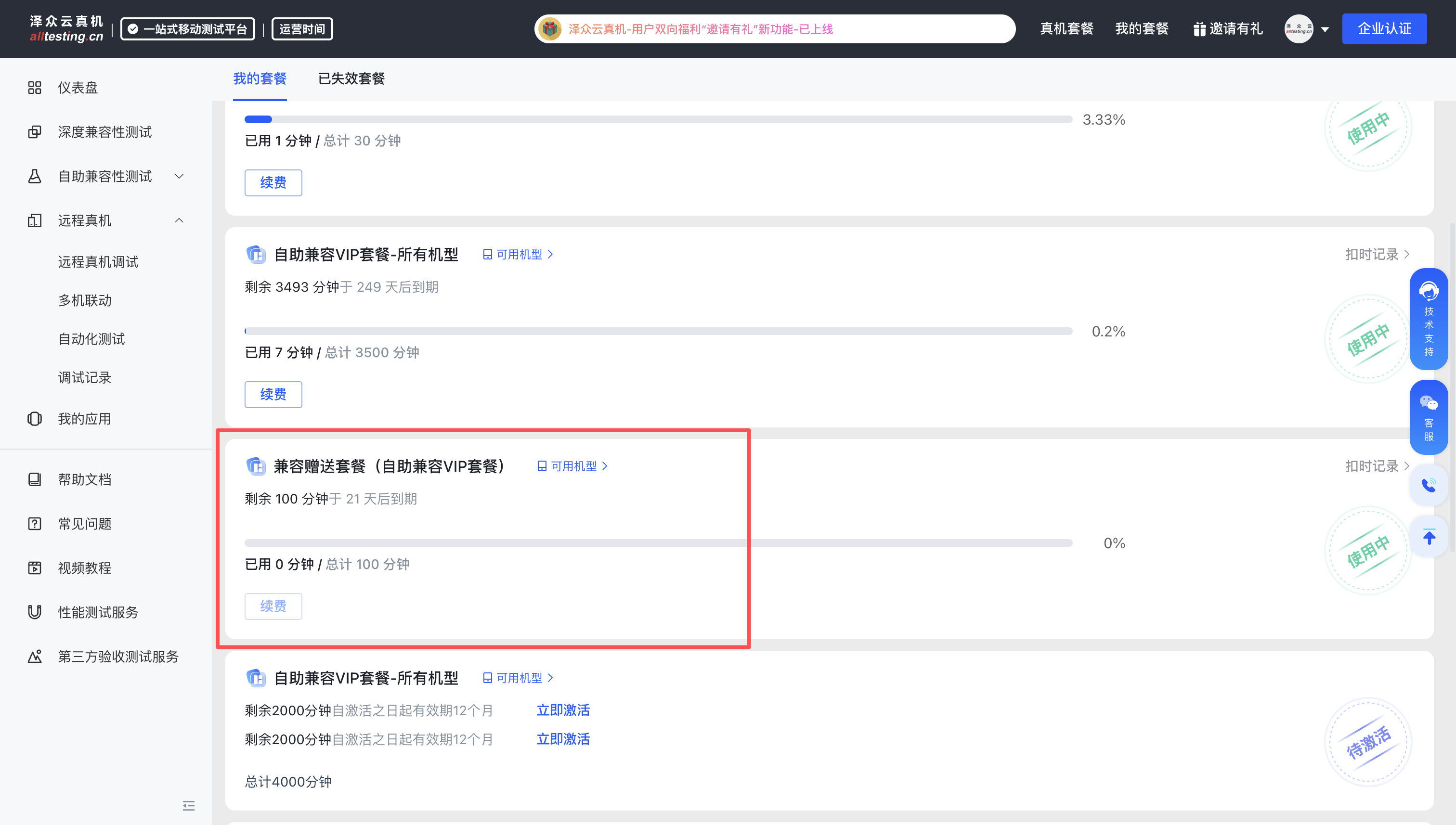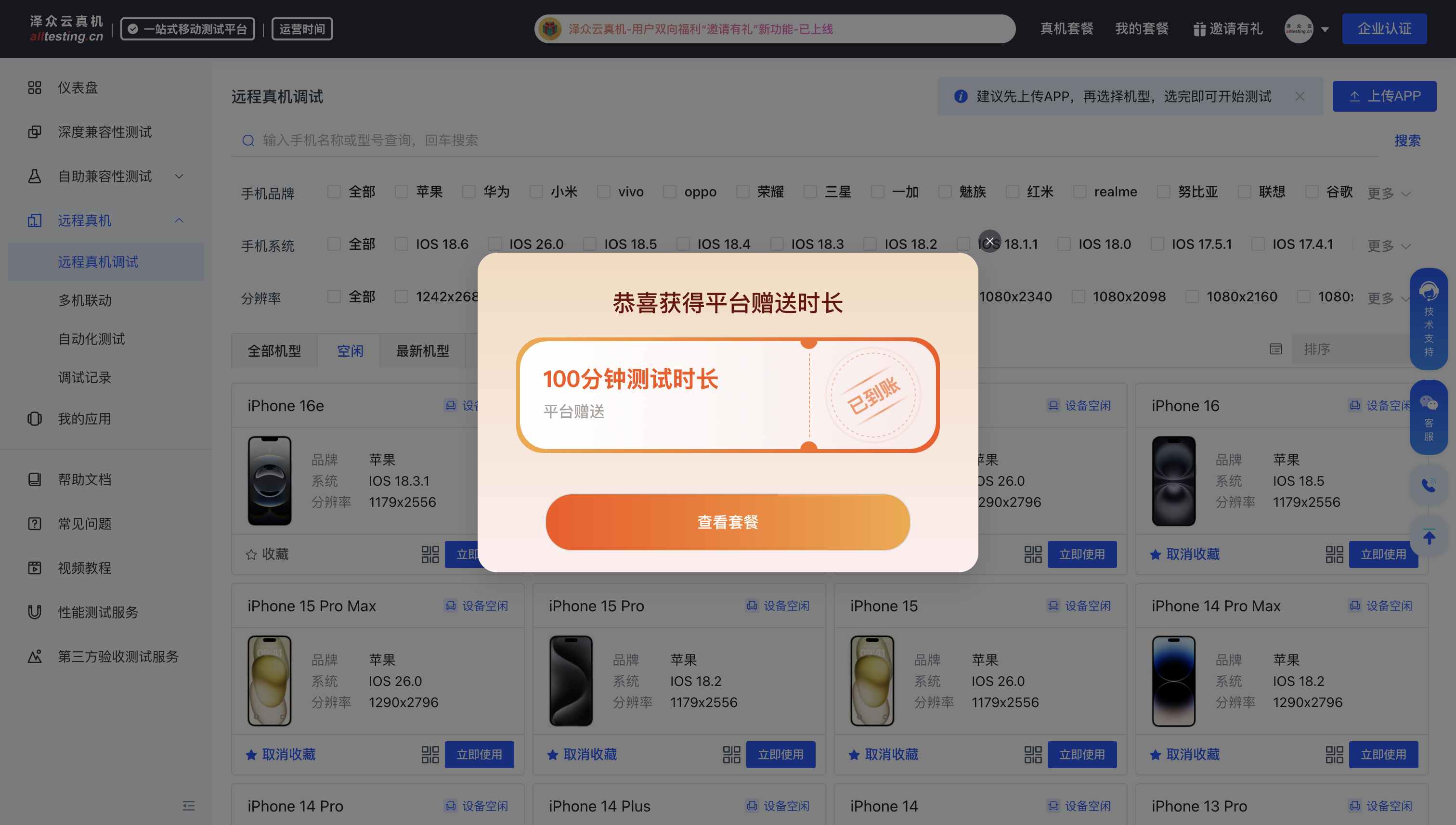 泽众云真机为了让更多的用户免费体验自助兼容性测试服务,2025年9月8日之前注册用户,在2025年9月8日到2025年9月30日登录云真机平台,系统将随机派送30-100分钟VIP自助兼容性测试时长套餐,平台用户仅有一次机会,秒送自动到账。