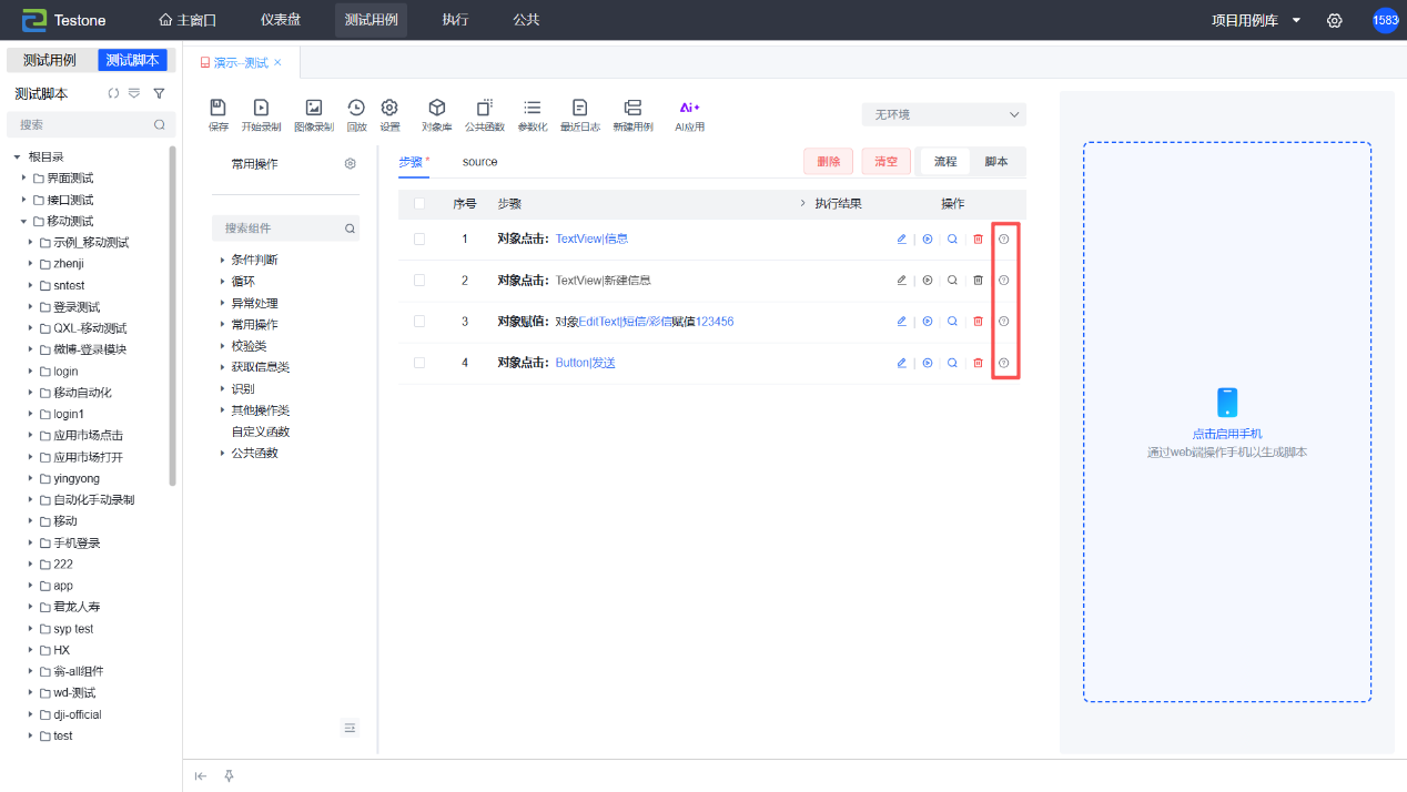 3、界面、接口、移动的目录和脚本放在左侧,测试脚本页面更加简洁明了。