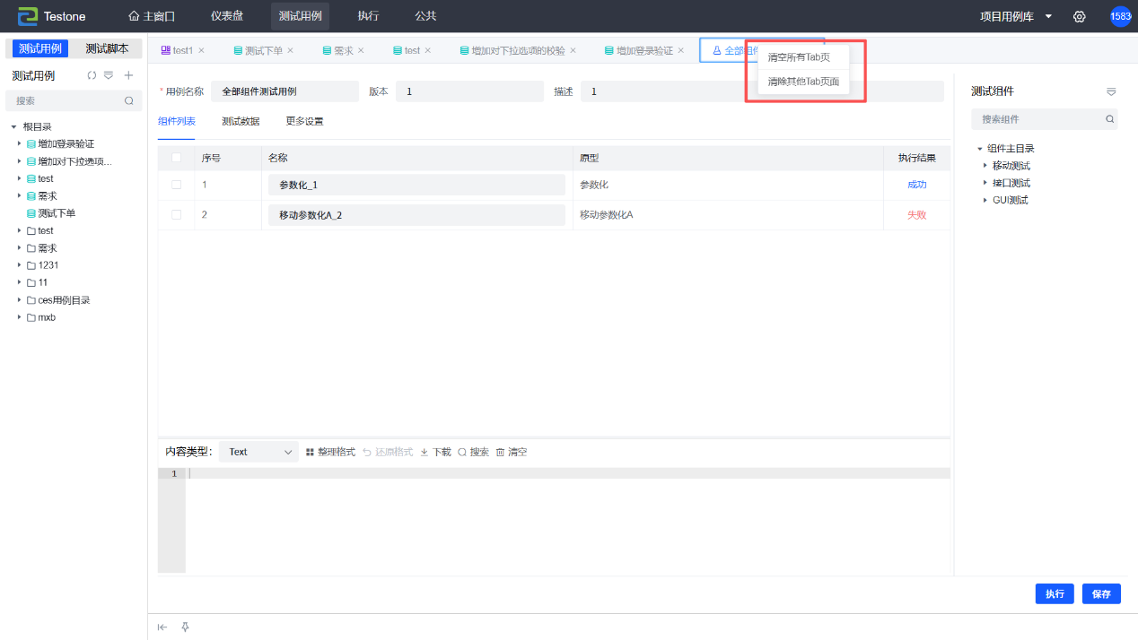 4、测试用例页面顶部增加tab,可全部清除所有tab以及清除其他tab页面