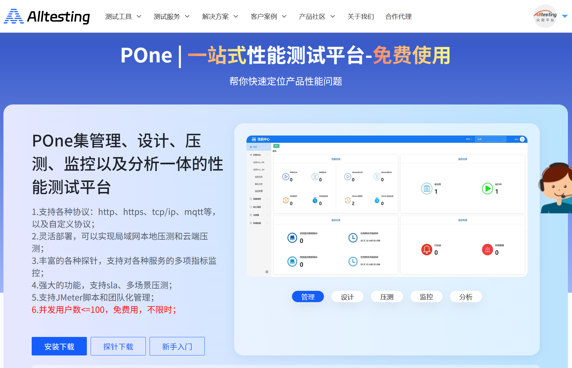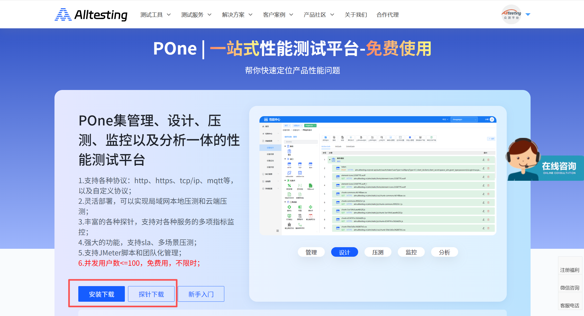 国内在线性能测试服务的平台也很多,大部分平台技术框架都是云端压测,不支持本地化部署,Alltesting平台POne性能测试服务完美解决了这个问题,且你在开发调试时,测试并发100VUM内免费使用,不记次数,不计费哦。