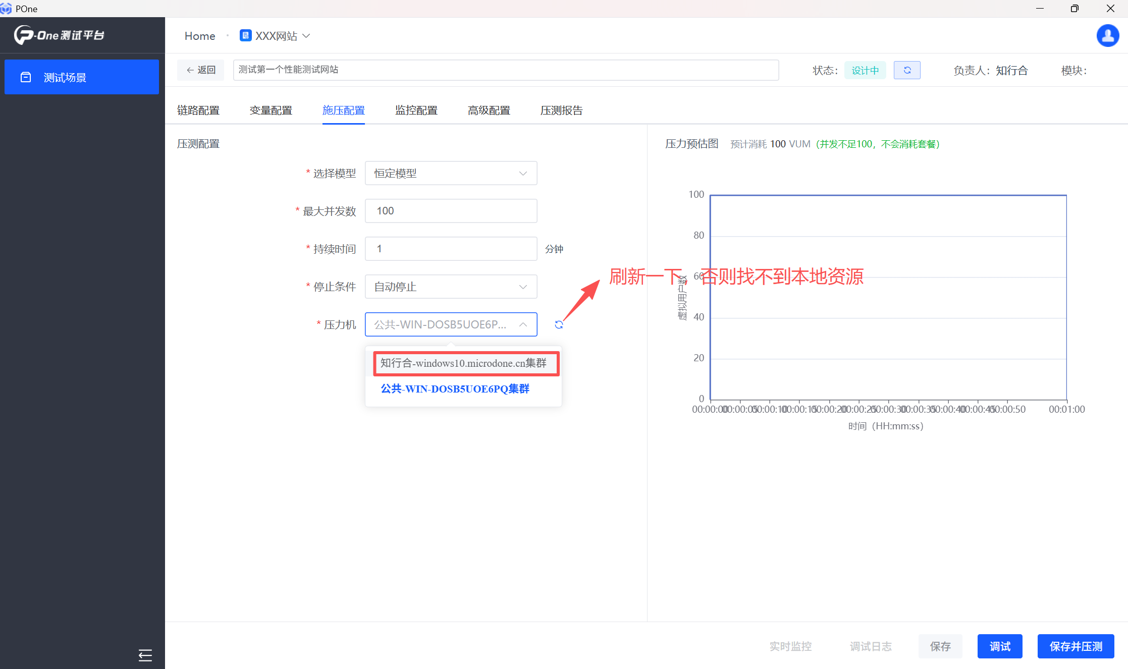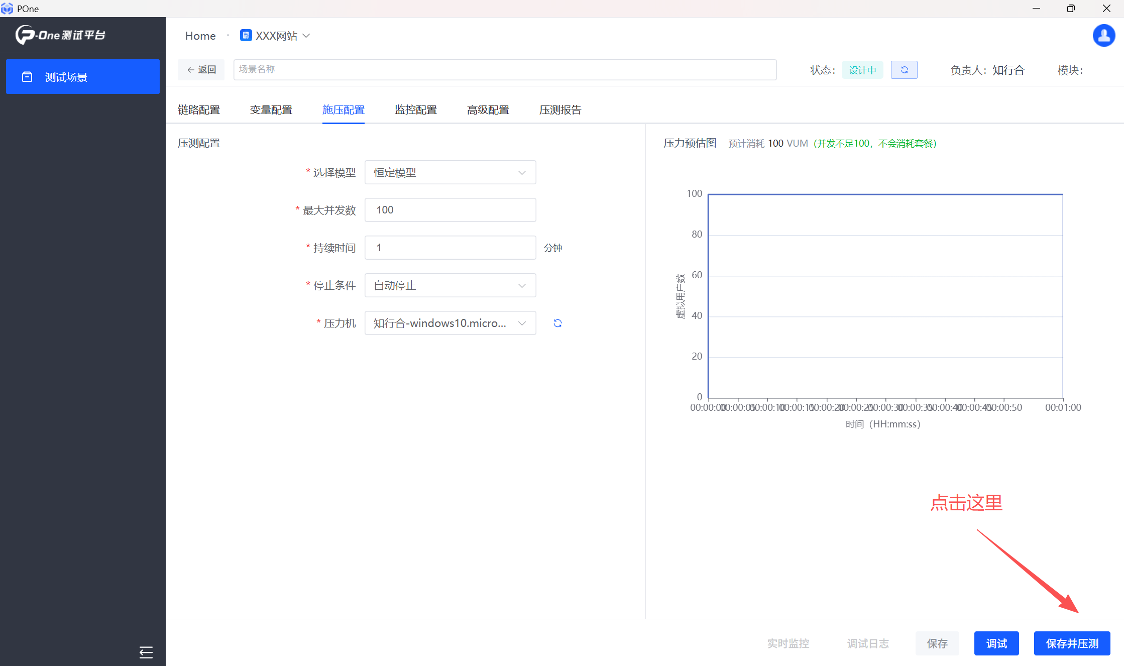 4、 施压配置,设置并发量、持续时间、压力机选择(重点);