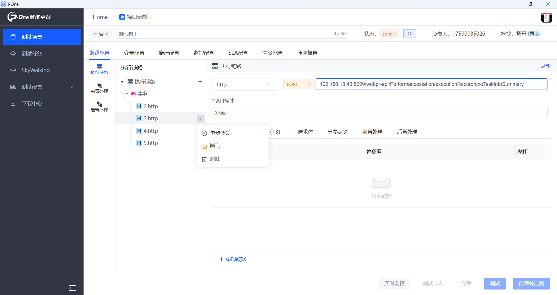 POne上个版本创建性能场景,需要手工来添加测试接口信息(见下面截图),对新手来说有点麻烦了,接口参数信息不能出任何错误,很容易出现调试失败。