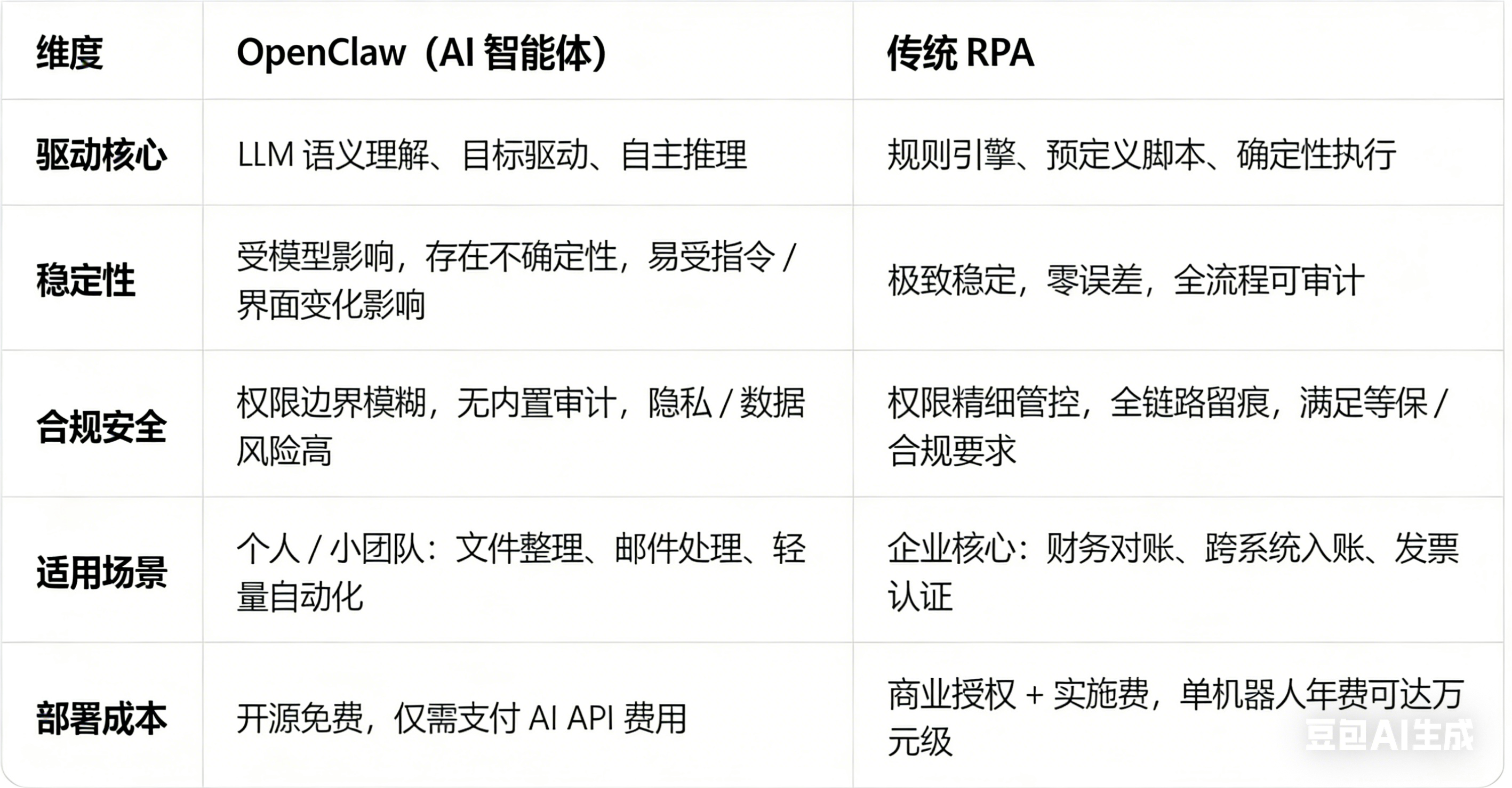 能力定位互补:OpenClaw 擅长理解自然语言、自适应界面变化、处理非结构化数据;RPA 擅长规则化重复操作、老旧系统兼容、全流程追溯。
