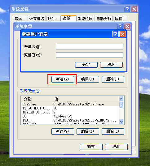 点击“环境变量”后,在弹出的“环境变量”对话框中点击“新建”按钮