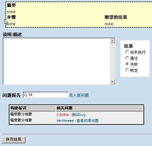 将每次执行失败后的BugID输入进去即可,多个bug用”,”格开(如图中的“2,34”)。点击“保存结果”后,可以看到bug的状态和标题了(如图中的2:Active - 测试bug)。
