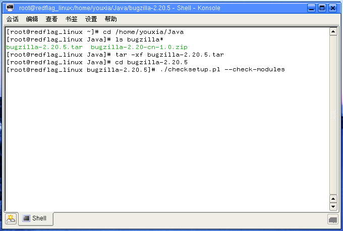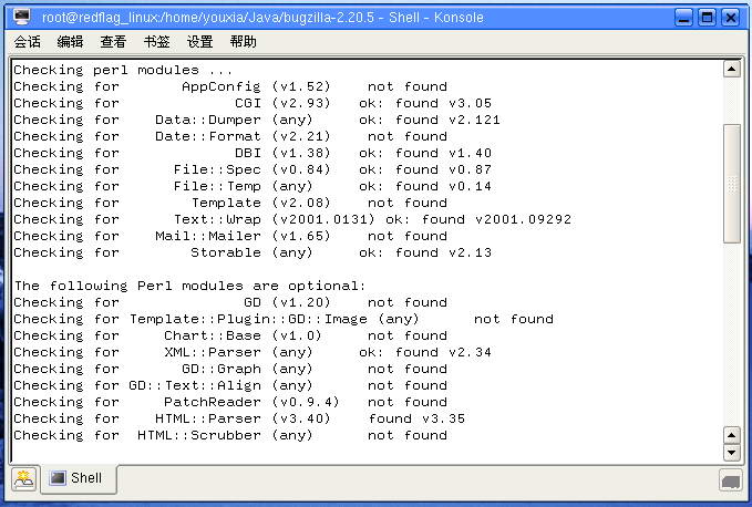 软件下载完成后,先将bugzilla-2.20.5.tar.gz解压,bugzilla的运行需要Perl的支持,红旗桌面中自带的Perl是 5.8.5版,已经够用了。但是Bugzilla需要的Perl模块红旗系统不可能都具备,因此,第一步是运行bugzilla中的 checksetup.pl脚本来测试一下我们还缺哪些模块,如下图: