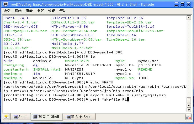 下载DBD::mysql模块,编译安装,安装的过程中需要指定参数,如果不指定,则需要调用mysql_config脚本来进行检测,因此,我采取的方法是将/usr/mysql4/bin加入到PATH变量,如下图: