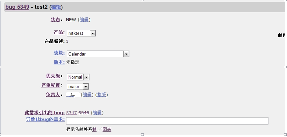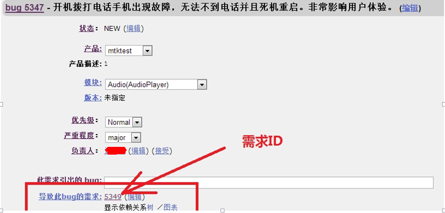 点击需求引出的某个bug链接 ,显示如下:"导致此bug的需求"处会显示需求链接。
