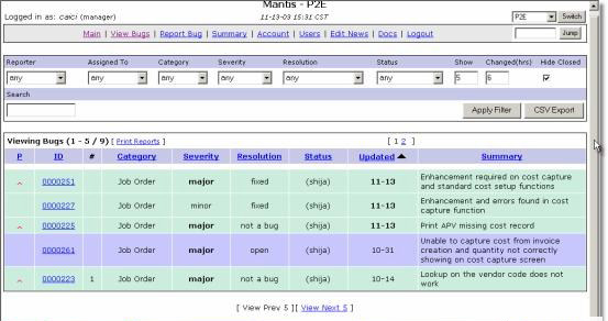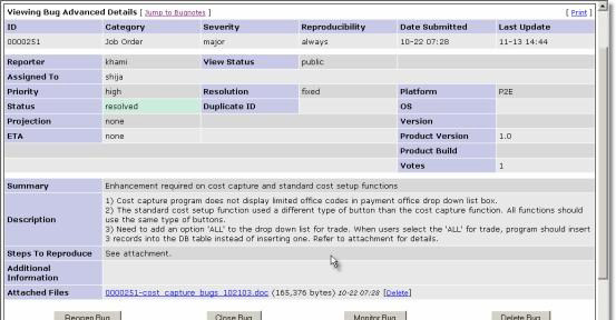 关于产品详细信息和支持,请访问主页http://mantisbt.sourceforge.net/,下图为查看所有Bug和查看详细Bug页面。