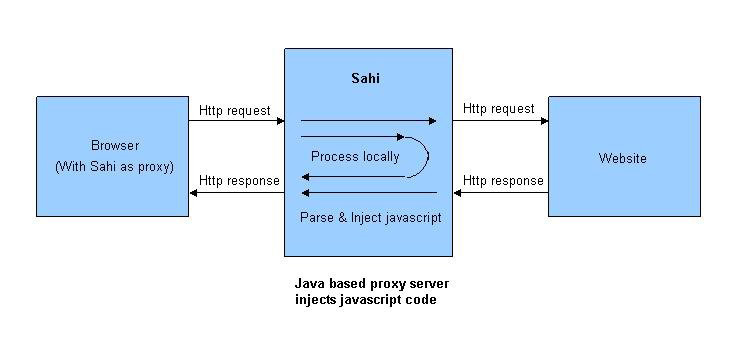 Web自动化测试的本质是模拟用户事件(单击、双击、输入文本等操作)获取结果状态并验证是否符合预期。如上图所示,Sahi的核心一个用Java编写的代理服务器。它位于Web应用与浏览器当中。当HTTP请求响应通过Sahi代理服务器时,便被注入了用来回放测试用例的Javascript。这些Javascript中,一部分是Sahi本身用来驱动脚本运行的代码,另一部分是用户代码被Sahi代理服务器解析成的Javascript。目前Sahi支持三种编程语言:Sahi脚本, Java和Ruby。