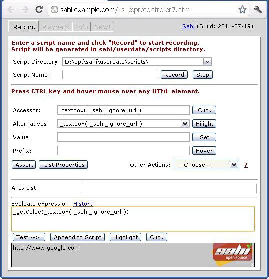 输入文件路径后点“录制”便开始录制,点“停”即停止录制,非常简单。标签页的中部是一个对象识别器,在页面上按住CTRL键,并将鼠标左键悬停在某个元素上,对象识别器显示出能够识别该元素的Sahi语句。另外,你可以在下方的输入框中直接输入Sahi语句并查看运行结果。