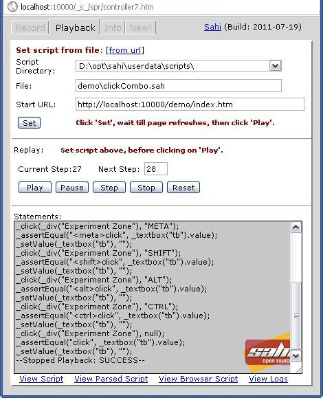 如果一切正常你会看到Dojo的Job Form Application应用被打开,然会进行了一系列操作后关掉。这时,如果一些正常,Sahi的控制台上会显示"Success"。如果失败了,你可以去sahi/userdata/logs/playback下面查看日志。
