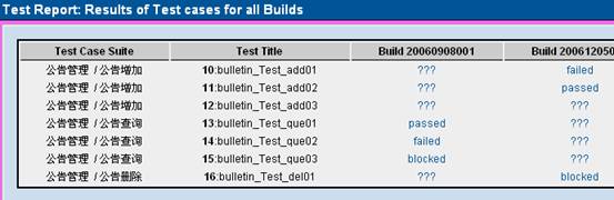 所有测试用例在不同build版本的执行情况,显示?的地方表示还未执行。