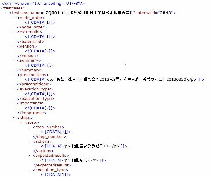 说实话,这个格式比较蛋疼,用python里的Elementtree来解析。关于数据存储格式,想到了每个testcase用字典dic_temp来存,把需要写入excel的项提取出来,由于每个case可能包括很多step,因此每个step的键代表步骤编号,值的话是一个列表list_temp,包括具体步骤和预期结果。