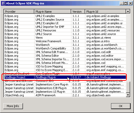 重新启动Eclipse后,在Help => About Eclipse SDK => Plug-in Details你可以看到由“FindBugs Project”提供的“FindBugs Plug-in”版本0.0.17插件,如下图所示: