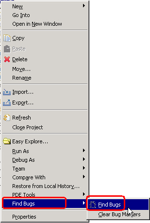 在Package Explorer或Navigator视图中,选中你的Java项目,右键,可以看到“Find Bugs”菜单项,子菜单项里有“Find Bugs”和“Clear Bug Markers”两项内容,如下图所示:
