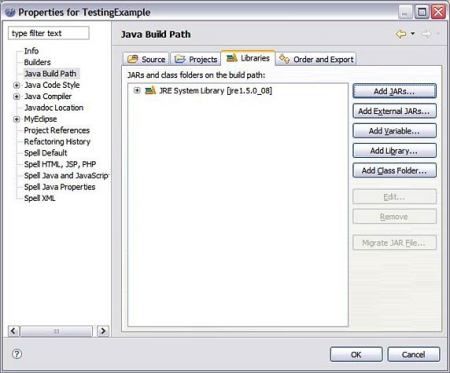 首先启动 Eclipse 集成开发环境 (IDE)。接下来,创建一个基本 Java™ 项目,稍后将把 JUnit、jMock 和 RMock Java Archive (JAR) 库导入到该项目中。将 Java 项目命名为 TestingExample。在 Java Perspective 内,选择 Project > Properties,然后单击 Libraries 选项卡,如下所示:
