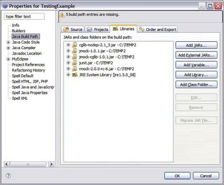 图 2. 已添加到 TestingExample 项目中的 jMock 和 RMock JAR