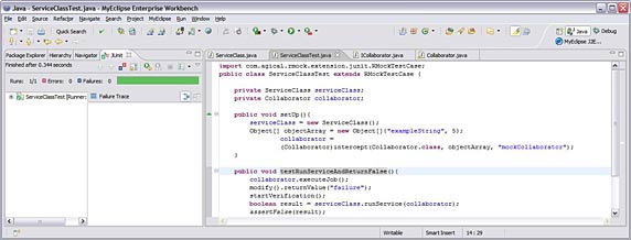 在测试方法本身 testRunServiceAndReturnFalse() 之内,您可以看到更多更改。模拟 Collaborator 对象的 executeJob() 方法将被调用。在此阶段,模拟对象处于记录状态 —— 即简单地定义对象将一直期望的方法调用,因此,模拟将相应地记录期望。下一行是对模拟对象的通知,用于确保当它遇到 executeJob() 方法时,它应当返回字符串 failure。因此,使用 RMock,您只需通过调用方法而不调用模拟对象(并传递它可能需要的任何参数)来描述期望,然后修改该期望以相应地调整任何返回类型。