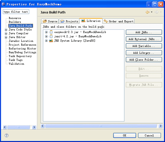 EasyMock 是采用 MIT license 的一个开源项目,您可以在 Sourceforge 上下载到相关的 zip 文件。目前您可以下载的 EasyMock 新版本是2.3,它需要运行在 Java 5.0 平台上。如果您的应用运行在 Java 1.3 或 1.4 平台上,您可以选择 EasyMock1.2。在解压缩 zip 包后,您可以找到 easymock.jar 这个文件。如果您使用 Eclipse 作为 IDE,把 easymock.jar 添加到项目的 Libraries 里可以使用了(如下图所示)。此外,由于我们的测试用例运行在 JUnit 环境中,因此您还需要 JUnit.jar(版本3.8.1以上)。