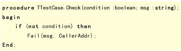 如果Check 没有通过的话,Dunit 将报错。错误提示在第二个参数中定义,其他有关类及方法的定义请看连机文档,文档放在Dunit 安装目录docAPIIDH_Library_DUnit_-_Xtreme_Unit_Testing_for_Delphi.htmInitialzation 代码完成测试单元的注册。