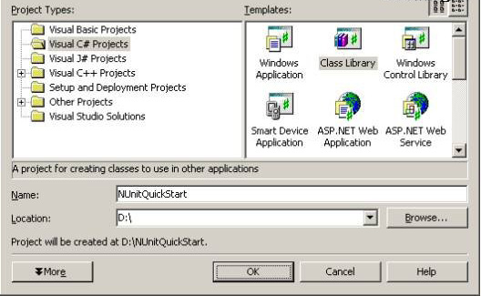 在Microsoft Visual Studio .NET中,让我们开始创建一个新的工程。选择Visual C#工程作为工程类型,Class Library作为模板。将工程命名为NUnitQuickStart.图4-1是一个描述本步骤的Visual Studio .NET。