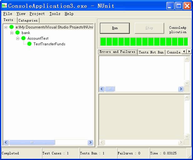 4)打开NUnit,File--Open,找到刚才编译生成的 exe。然后 Run,满眼可爱的绿色,说明测试都成功了^_^。