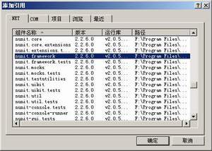 在“.NET”选项卡中找到组件名称为nunit.framework的一项,点击“确定”按钮,此时在项目中可以使用NUnit类库了。
