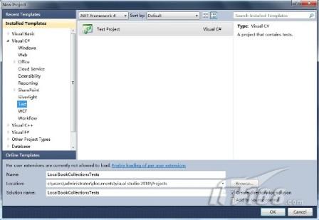 打开Microsoft Visual Studio 2010,创建一个C#测试项目,项目名称为LocalBookCollectionsTests,如图5所示。