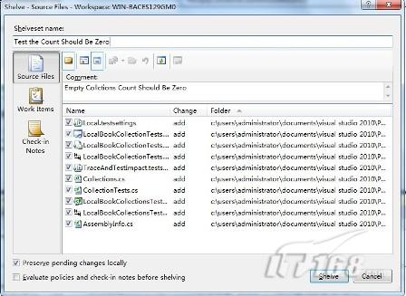 通常由于你并不想在所有相关单元测试通过之前,与团队的其他成员共享文件,因此保持VSTS存储库中搁置自己的文件版本,而不是将你的变更点签入到团队代码库的分支中。完成所有单元测试后,可以直接点击Check In 按钮将此代码加入到存储库中。Pending Changes搁置窗口,如图9所示。