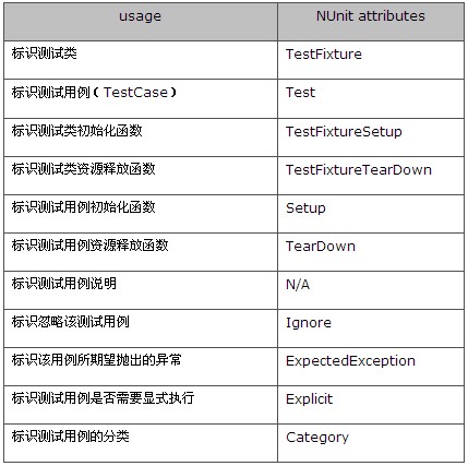 这是一个简单的单元测试方法了。首先我们使用using NUnit.Framework和using NUnitTest,因为接下来的代码需要用到这两个命名空间。在这里,我们要注意几点,NUnit测试用的类前面一定要加上[TestFixture],以表示这是NUnit测试类;测试方法一定是public的,且没有返回值。这里的TestFixture和Test都是NUnit的Attribute,下表给出了NUnit常用的Attribute: