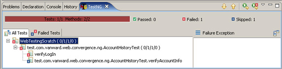 通过 TestNG 的 Eclipse 插件(例如)运行该测试时,如果 verifyLogIn 测试失败,TestNG 将直接跳过 verifyAccountInfo 测试,请参见下图 :