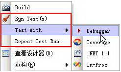 Test With:点击后将会显示子菜单:Debugger 使用NET的调试器调试;.NET 1.1将此方法运行在NET1.1框架下;Coverage 将会启动TestDriven.NET 自带的NCoverExplorer 进行代码覆盖分析;In_Proc 不太清楚有什么用。