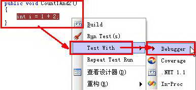 我们来开始使用TestDriven.NET 来调试我们的第一个方法吧: