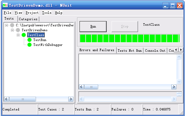 在上面的测试代码中,我们仅仅是点击了右键菜单Run Test,并没有选择运行哪一个测试方法或者测试类,那么TestDriven.NET 2.0是如何选择并运行测试的呢?其实这跟我们点击鼠标的位置有关,点击鼠标的位置如果在标记为Test的测试方法内,它只会执行该测试方法;点击鼠标的位置如果在方法之外而在标记为TestFixture的类里面,它会执行该类中所有标记为Test的测试方法;点击鼠标的位置如果在类之外,而在某一个命名空间里面,则它会执行该命名空间下所有标记为TestFixture的测试类。