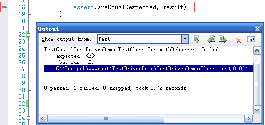 稍微写过一点单元测试代码的朋友都知道,实际开发中的每一个测试,测试方法都不可能只有一个断言(Assert),在以前使用NUnit时,测试如果通不过,我们无法根据错误信息快速准确的定位到代码中的某一个断言,有了TestDriven.NET 2.0,当测试出现错误时,您只需要在Output窗口中双击错误提示,可以直接定位到出错的断言代码行,极大的提高了排错的效率。